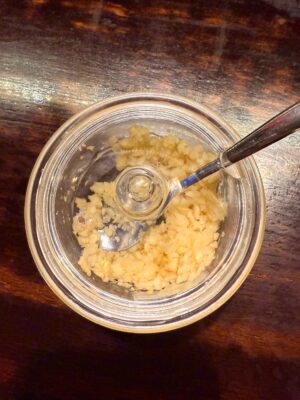 Tỏi củ tươi được bóc tách vỏ sạch và xoay nhuyễn ra . Vị cay nồng của tỏi .